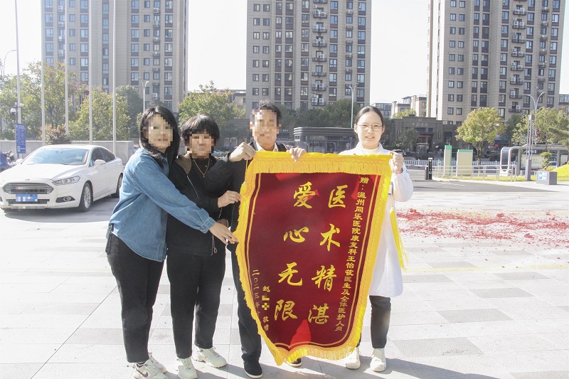 11月22日温州同乐医院门前响起阵阵鞭炮声,57岁的赵阿叔迈着稳健的步伐,将一面印有“医术精湛,爱心无限”锦旗递到了我院康复科王怡筱医生手上,他激动地说:“我一定要亲自把这锦旗送到你手上,多亏了你们,我现在才能重新独立行走……”